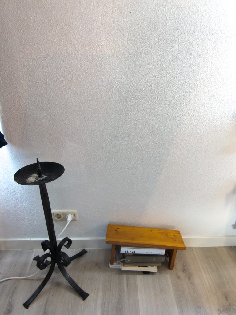 Aan het einde van de dienst wordt dan die Paaskaars – teken van Gods overwinning op de dood! – de kerk uitgedragen. In mijn kamer heb ik een heilig hoekje. Ik maak deel uit van die wereldwijde kerk. Er staat ook een paaskaars en ik lees deze dagen intensief de verhalen over Jezus, de houding en de (mis)daden van de mensen. Mijn kaars is ook uit. De kandelaar is leeg. Aan de muur hangt ook even niks. Leegte.